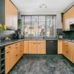 De keuken is aan de voorzijde van de woning gelegen en bestaat uit een groot U-vormig keukenblok met diverse inbouwapparatuur, te weten; koelkast, 4-pits gaskookplaat, combimagnetron, vlakscherm afzuigkap en vaatwasser alsmede veel werk- en kastruimte.
