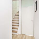 Als je de auto op eigen terrein geparkeerd hebt kom je bij de voordeur. De entree naar de hal met toegang tot de toiletruimte met closet en fonteintje, meterkast, modern beklede trapopgang naar de 1e verdieping en deur naar de woonkamer.