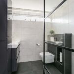 De modern en luxe afgewerkte badkamer (2020) is geheel betegeld en voorzien van een grote inloopdouche van 1.2 meter met glazen wand, regen- en handdouche en thermostaatkraan, badkamermeubel met wastafel en spiegelkast met verlichting, wandkast, vloerverwarming, hangend closet met bidet en mechanische ventilatie. Fijn is het raam welke zorgt voor natuurlijke lichtinval en de mogelijkheid tot ventilatie middels de roosters.