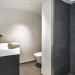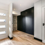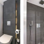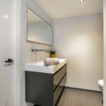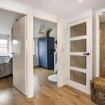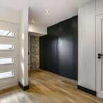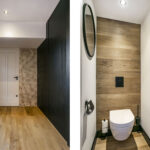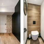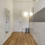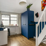 De ruime hal met moderne pvc-vloer en vloerverwarming geeft toegang tot de vernieuwde meterkast, handige kastenwand met wasmachineaansluiting en heel veel bergruimte. De moderne toiletruimte is voorzien van een hangend closet. De garage is zowel van binnen als buiten bereikbaar.