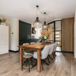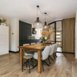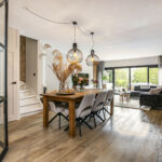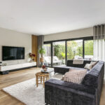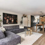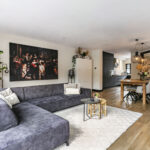 Via de stoere stalen taatsdeur kom je in de ruime woonkamer (ca. 45 m²), waar je direct een warm en huiselijk gevoel ervaart. De sfeervolle open haard, de pvc-vloer en vloerverwarming dragen hieraan bij. Verder is er veel lichtinval dankzij de grote aluminimum schuifpui naar de tuin. De glad gestucte wanden en plafond zorgen voor een strakke afwerking van de woonkamer.