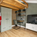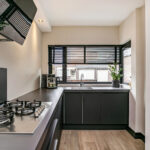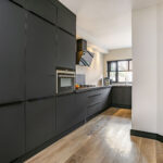 De luxe keuken aan de voorzijde is uitgevoerd in matzwart met een composiet werkblad en voorzien van inbouwapparatuur zoals een koelkast, vriezer, gaskookplaat, afzuigkap, vaatwasser en combi-oven.