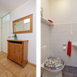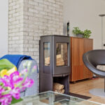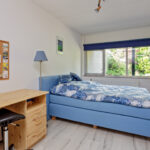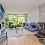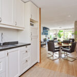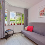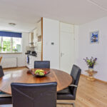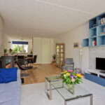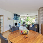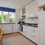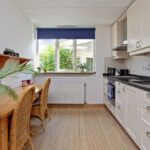 Binnen geniet je van een lichte woonkamer met houten vloer en grote raampartijen die zorgen voor veel daglicht en een sfeervolle houthaard. De open keuken is modern en compleet uitgerust met een natuurstenen werkblad, inductiekookplaat, oven, afzuigkap, koelkast en vriezer. Een fijne plek om te koken én samen te zijn.