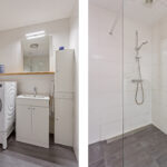 De woning beschikt over twee slaapkamers, waarvan de grootste aan de achterzijde is gelegen en daar bevind zich tevens een vaste kast. De 2e slaapkamer ligt aan de voorzijde. Beiden slaapkamers zijn voorzien van een laminaatvloer. En een nette afgewerkte badkamer met inloopdouche en wastafel. Daarnaast tref je hier de aansluitingen voor de wasapparatuur.