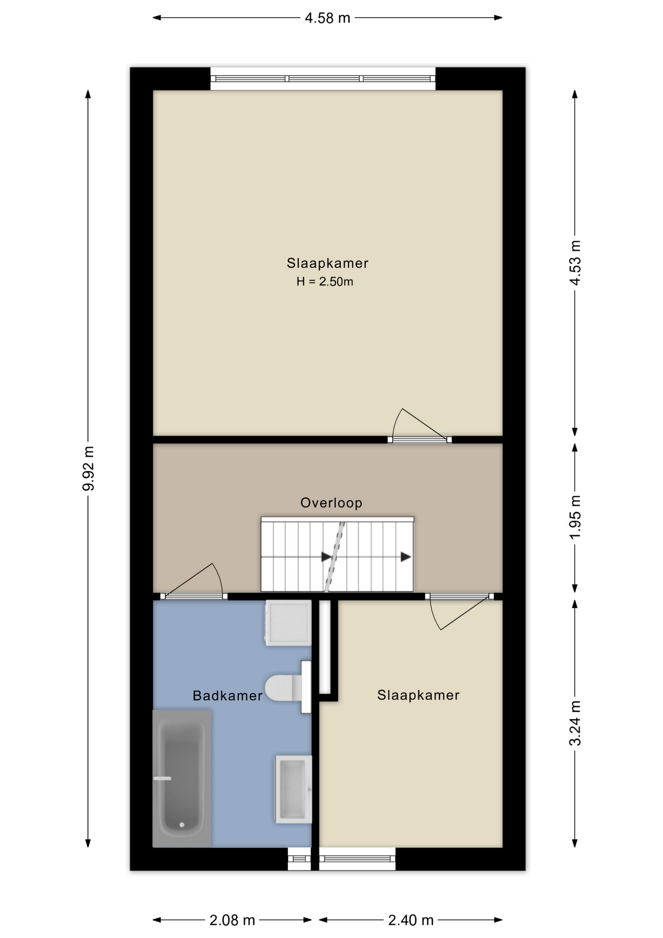 Op de eerste verdieping vind je een ruime overloop die toegang biedt tot twee ruime slaapkamers. De badkamer met ligbad, wastafelmeubel en tweede toilet zorgt voor rust en ontspanning na een lange dag. De wasmachine-aansluiting voegt praktisch gemak toe aan deze verzorgde ruimte.