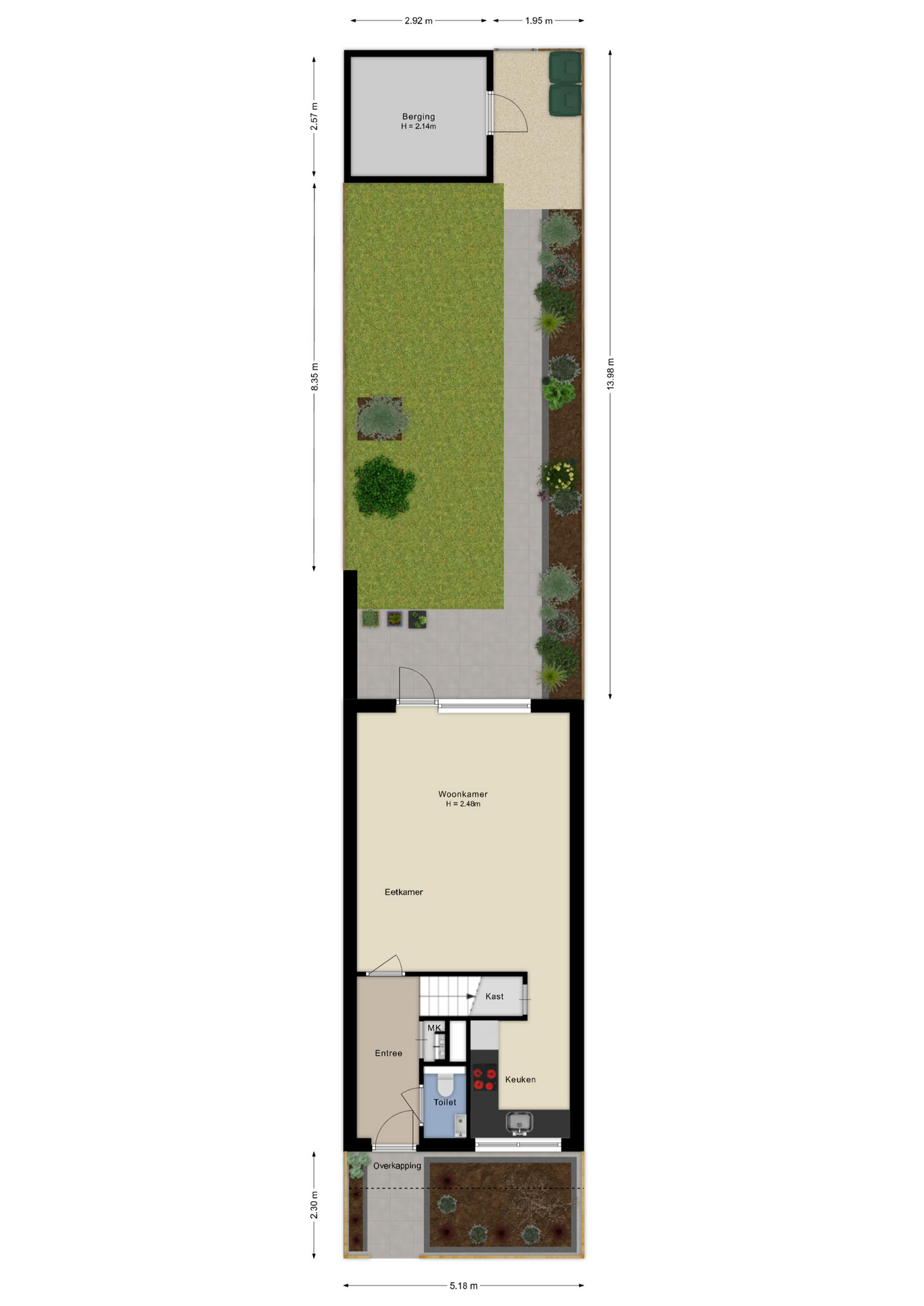 Betreed de hal en je vindt direct de toegang tot het toilet, de meterkast en de trapopgang. De woonkamer met vloerverwarming verwelkomt je met open armen en laat een stroom natuurlijk licht binnen dankzij de grote ramen die uitkijken op de achtertuin. De open inbouwkeuken staat garant voor gemakkelijke interactie tijdens het koken. Via de woonkamer loop je zo de tuin in, waar kinderen veilig kunnen spelen of waar je zelf kunt genieten van een kop koffie in de ochtendzon.