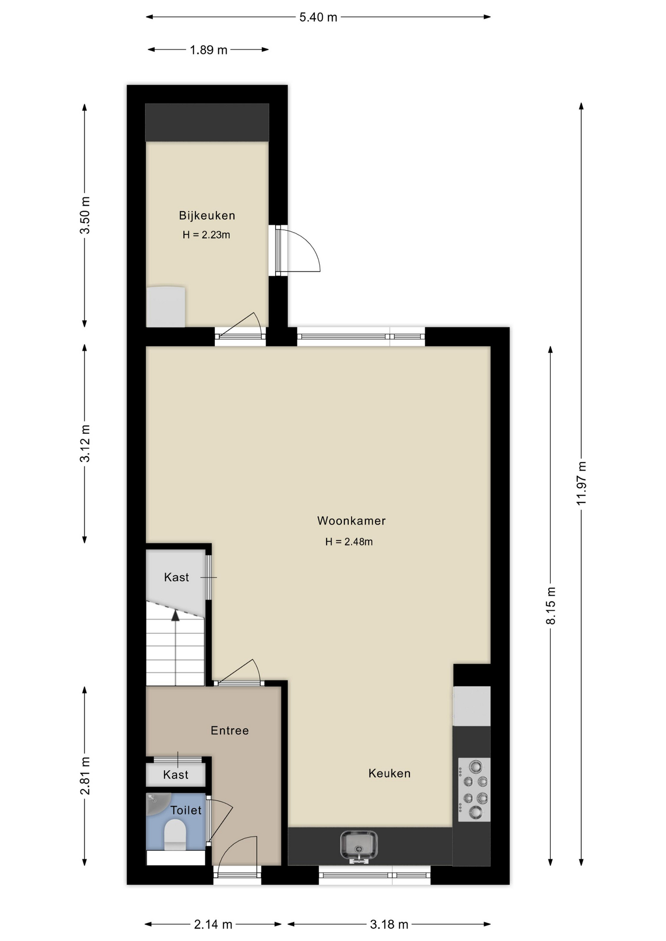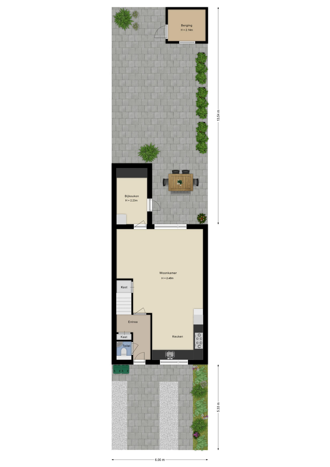 Voortuin/ oprit. Via de entree kom je in de hal met de meterkast en het toilet. Vanuit deze hal loop je door naar de ruime en lichte woonkamer. Aan de voorzijde van de woning bevindt zich de open, moderne keuken (vernieuwd in 2017), voorzien van diverse inbouwapparatuur.