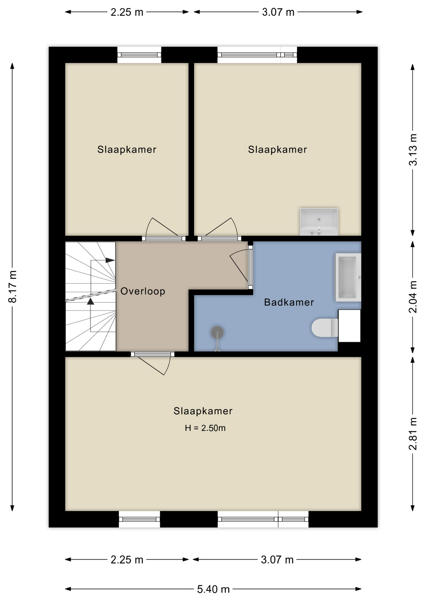 Via een afgesloten vaste trap bereik je de eerste verdieping. Hier bevinden zich drie comfortabele slaapkamers. De grootste slaapkamer ligt aan de voorzijde van de woning, terwijl de andere twee kamers aan de achterzijde zijn gesitueerd. Ideaal als kinder-, werk- of logeerkamer! Op deze verdieping vind je tevens de badkamer (vernieuwd in 2017), voorzien van een toilet, wastafelmeubel en inloopdouche.