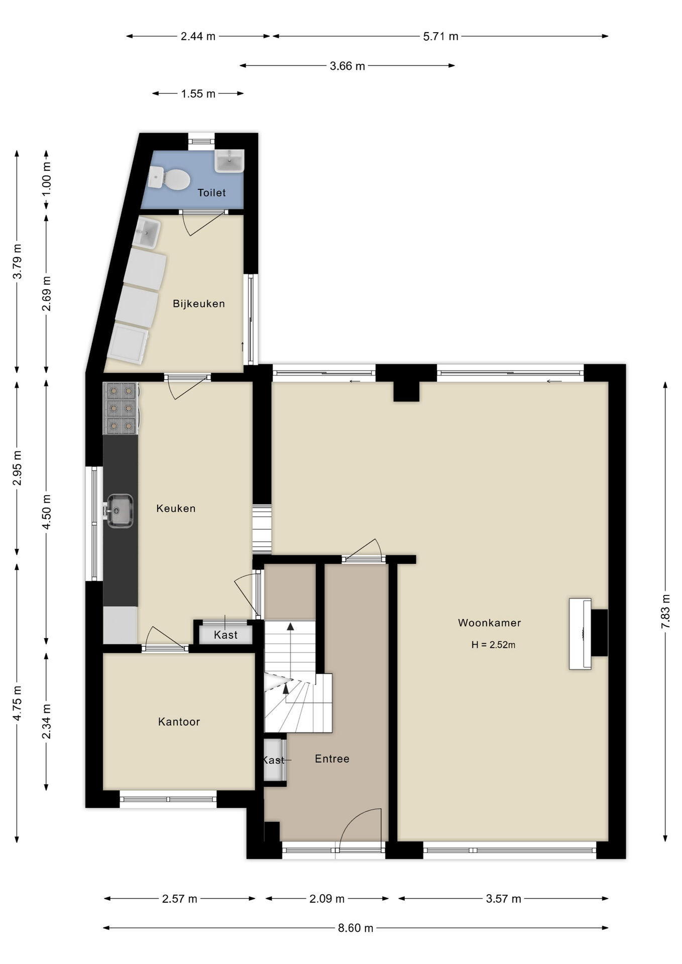 Aan de voorzijde is een kantoorruimte gesitueerd; perfect voor thuiswerken. Achter de keuken bevindt zich de bijkeuken met witgoedaansluitingen en een separate toiletruimte, met toegang tot de tuin.