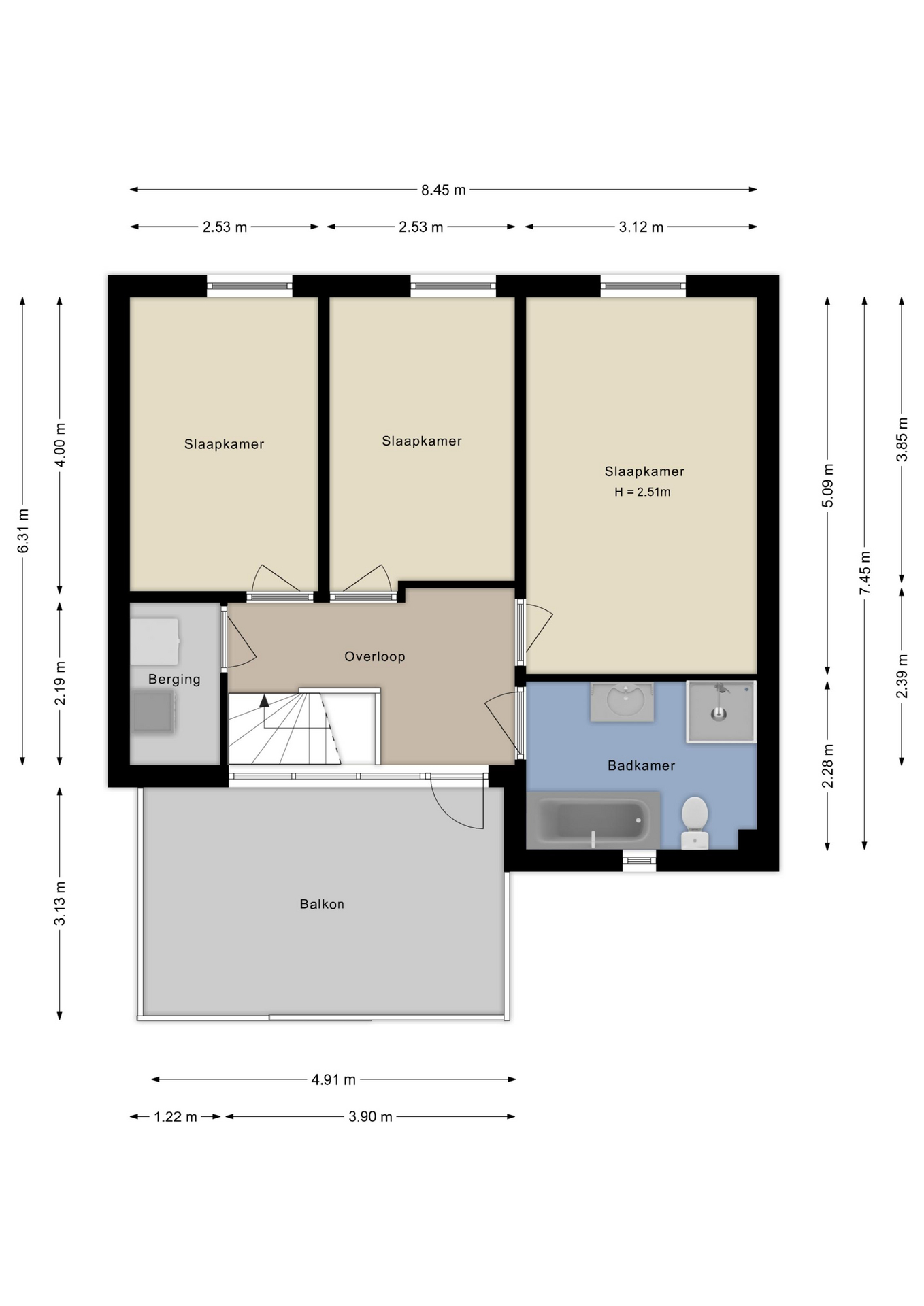 Hier vind je drie ruime slaapkamers, de badkamer en een overloop waaraan het ruimte balkon zich bevindt. De slaapkamers zijn ideaal om in te richten als kinderkamers, een hoofdslaapkamer of zelfs een werkruimte. De badkamer is voorzien van een douche, ligbad, wastafel en toilet, met genoeg ruimte voor iedereen in huis.