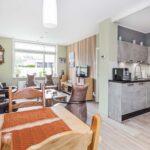 De woonkamer loopt tevens haast ongemerkt over in de keuken, die is voorzien van een groot en modern keukenblok in U-opstelling met composiet aanrechtblad, koelkast, 5-pits inductie kookplaat, oven, afzuigkap, vaatwasser en veel werk- en kastruimte.
