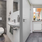 Via een deur in de keuken is de achtergelegen hal toegankelijk. Deze hal is voorzien van een tegelvloer, glad gestucte wanden -en plafond en de modern afgewerkte toiletruimte. Daarnaast biedt de hal toegang tot de badkamer, de multifunctionele studio/(werk-)kamer en de grote bijkeuken, die is voorzien van een tegelvloer met vloerverwarming, CV-opstelling, vaste schuifkastenwanden, uitstortgootsteen en buitendeur naar de voortuin.