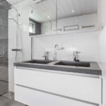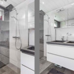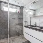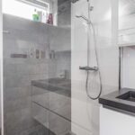 De badkamer is modern afgewerkt, geheel betegeld en voorzien van een grote inloopdouche met thermostaatkraan en regen- en handdouche, breed badmeubel met twee stenen wastafels, spiegelkast, radiator en raampartij.