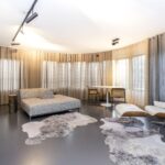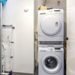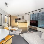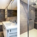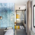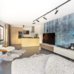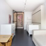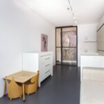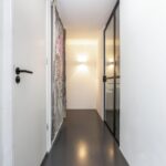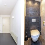 Kom binnen in de ruime hal, waar direct de nette afwerking zichtbaar wordt: lichte wanden, stalen deuren, en een prachtige, donkere gietvloer. Hier tref je de meterkast, de grote wasruimte ten behoeve van de witgoedaansluitingen en de cv-ketel opstelling, een toiletruimte met fontein en de badkamer. Je krijgt tevens toegang tot de woonkamer met open keuken en de slaapkamers.