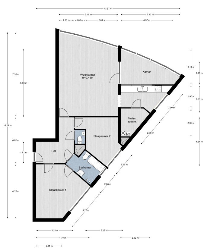 Bij binnenkomst betreedt u een ruime L-vormige hal met voldoende ruimte voor een garderobe. Vanuit de hal is het separate toilet met fontein bereikbaar. De lichte woonkamer is voorzien van grote raampartijen, elektrische screens en biedt toegang tot de serrekamer. De halfopen keuken is uitgerust met een elektrische kookplaat en een afzuigkap. Vanuit de keuken is de inpandige berging bereikbaar, waar zich de elektrische boiler bevindt evenals de aansluitingen voor wasmachine en droger. Het appartement beschikt over twee volwaardige slaapkamers. Eén van de slaapkamers heeft directe toegang tot de badkamer (en suite). De badkamer is ingericht met een ligbad, een separate douchehoek, een wastafel en een tweede toilet.