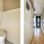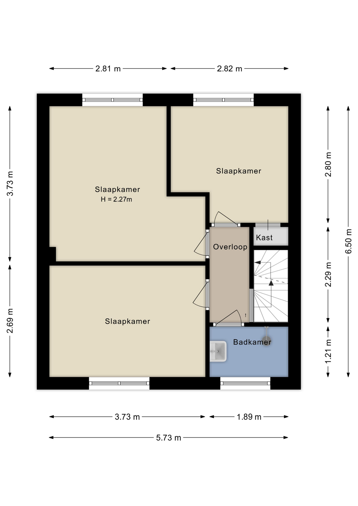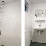 Overloop met toegang tot drie slaapkamers, waarvan één aan de voorzijde en twee aan de achterzijde. De volledig betegelde badkamer is uitgerust met een douche en een wastafel. Dankzij het raam is natuurlijke ventilatie mogelijk.