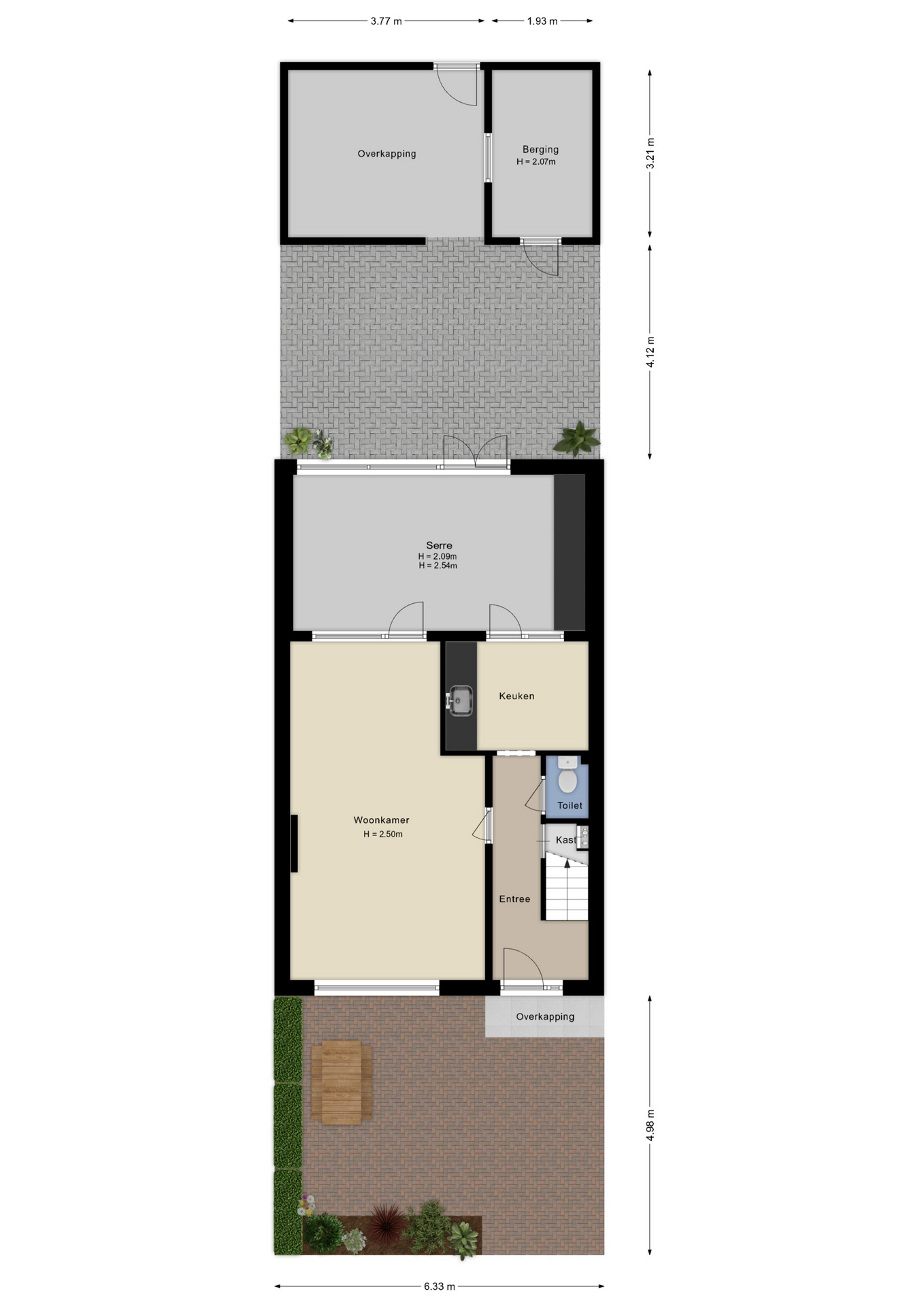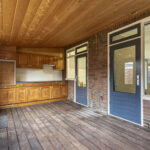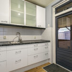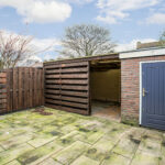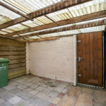 Vanuit de keuken is de aangebouwde houten aanbouw bereikbaar. Deze ruimte is voorzien van een eenvoudig keukenblok en geeft toegang tot de achtertuin. De volledig bestraatte achtertuin beschikt over een stenen berging met ruimte voor fietsen en gereedschap, een overkapping met buitenkeuken, een achterom en een waterkraan aan de gevel.