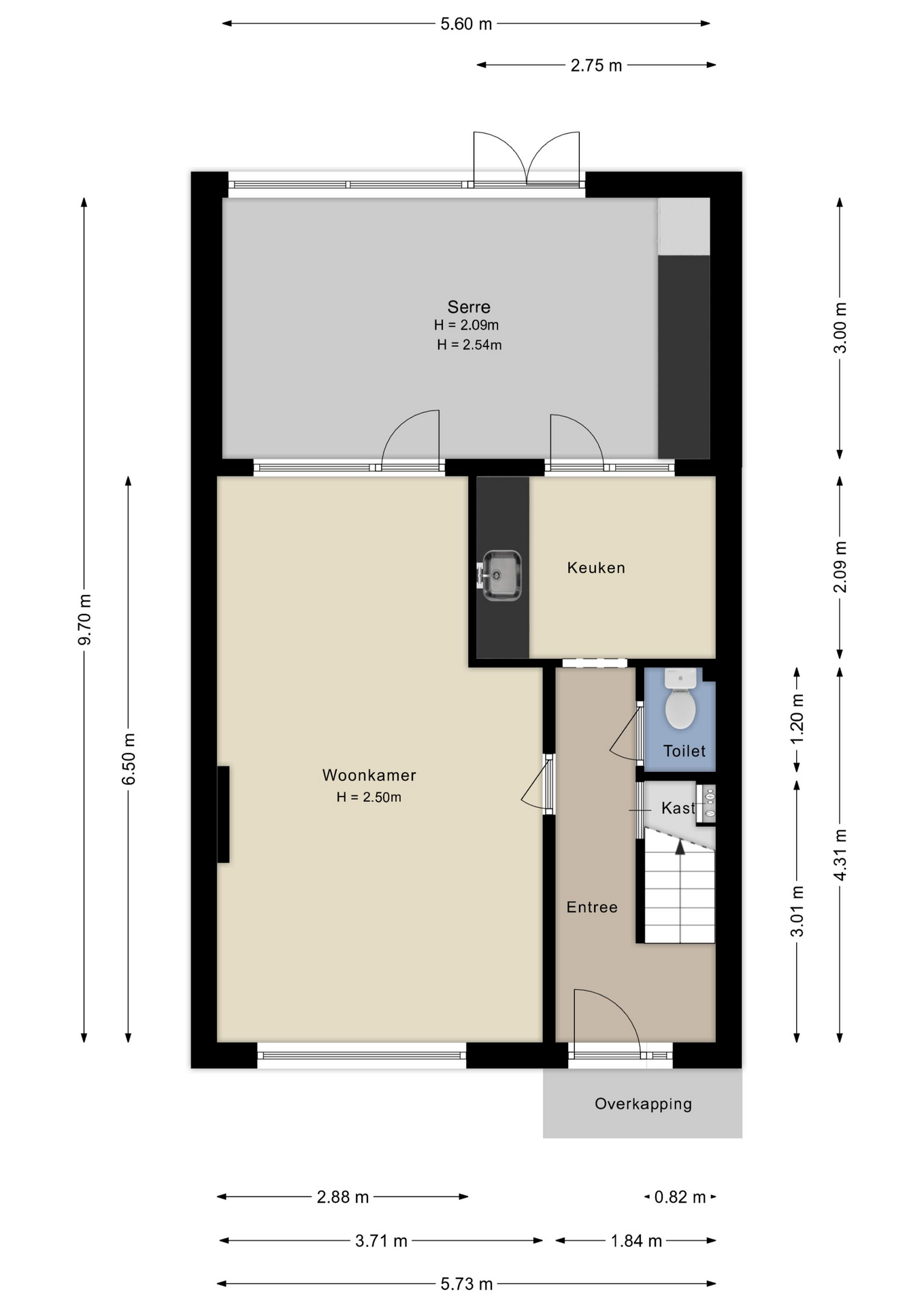 Entree met hal, meterkast, toilet en trapopgang. Onder de trap bevindt zich een praktische kelderkast. De lichte doorzonwoonkamer biedt voldoende ruimte voor een comfortabele zithoek en een eetgedeelte en geeft toegang tot de achtertuin. De dichte keuken is voorzien van een eenvoudig keukenblok en aansluitingen voor apparatuur.