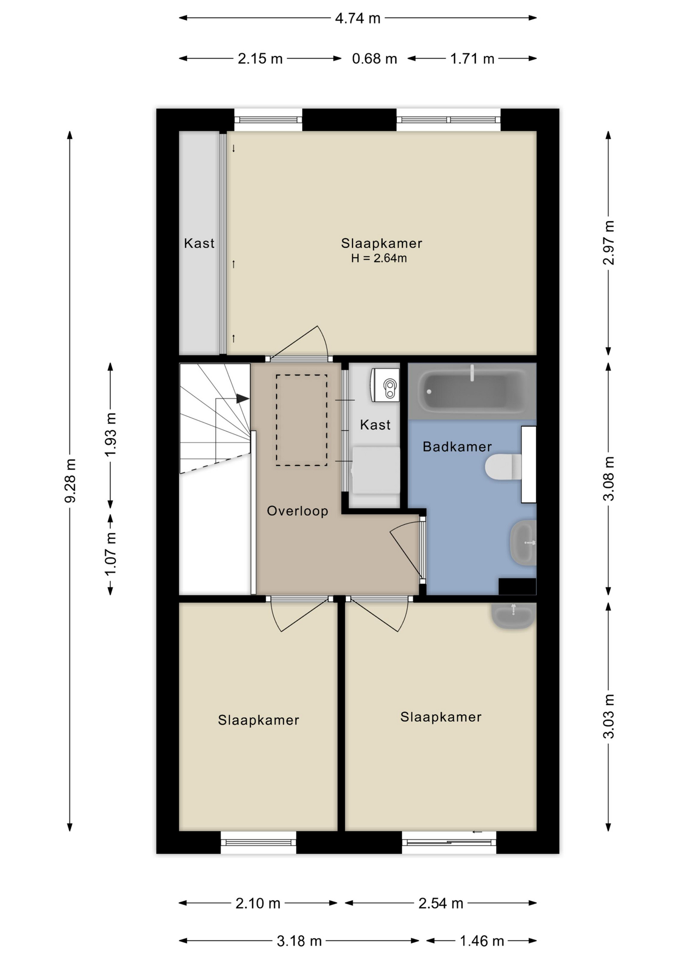 Op de eerste verdieping bevinden zich drie slaapkamers, een badkamer en een ingebouwde berg-/wasruimte. De ruimtes zijn efficiënt ingedeeld en bieden voldoende mogelijkheden voor een gezin.