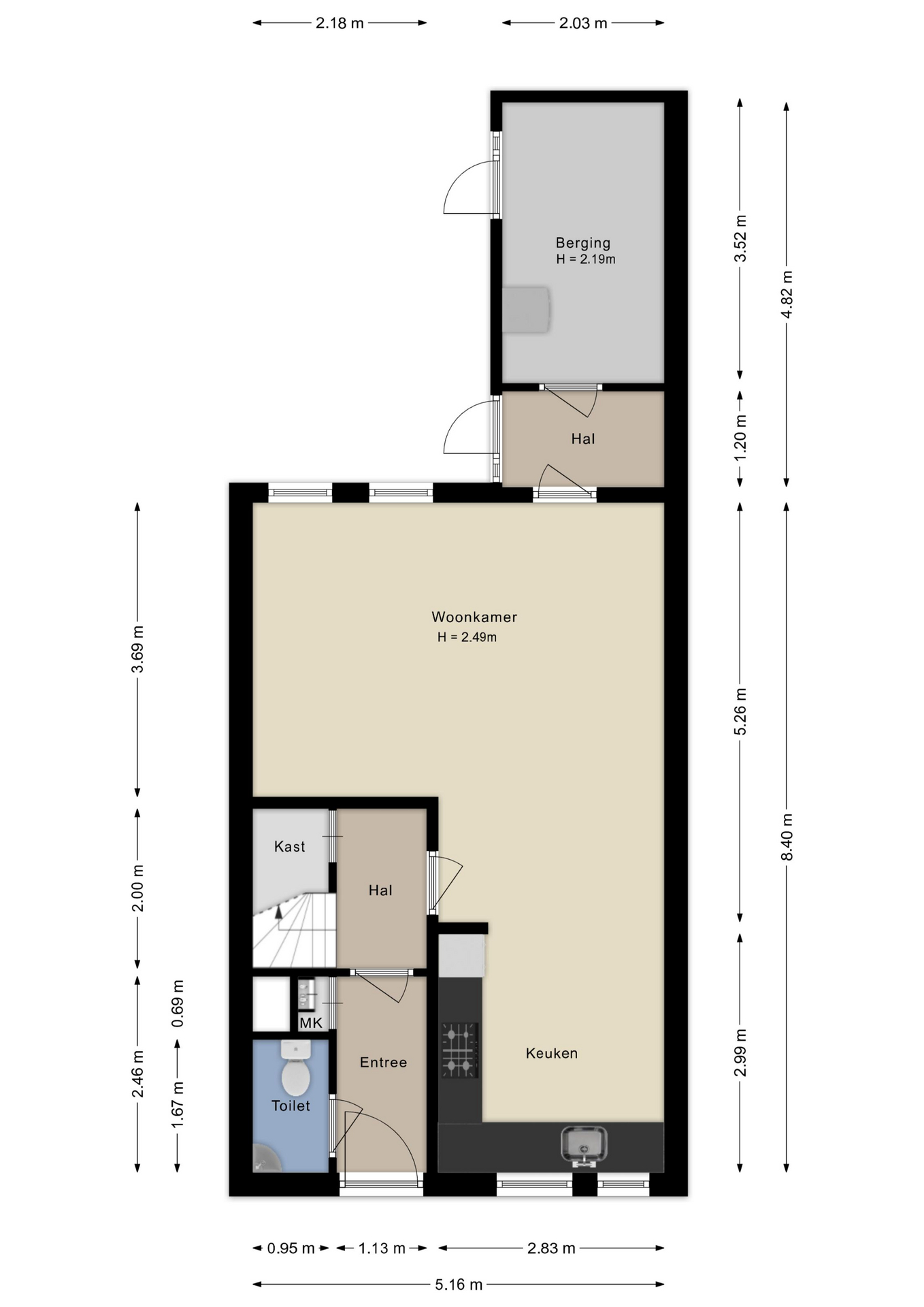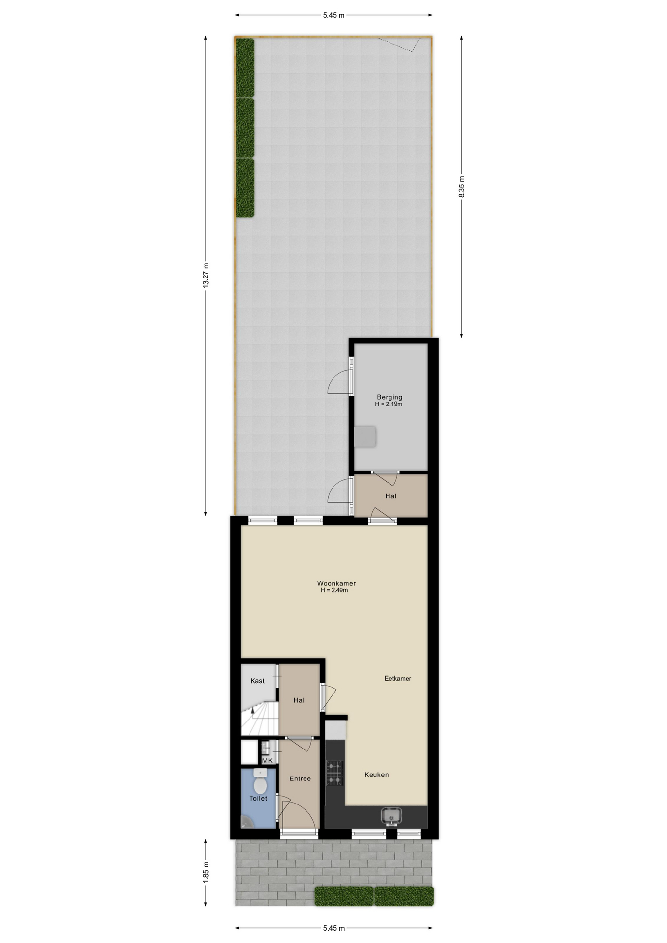 Je stapt het huis binnen via de hal waarin je de meterkast, trapopgang, en toilet met fontein vindt. De hal vormt de entreepoort naar de woonkamer, die door de grote ramen in verbinding staat met het buitenlicht. De neutrale open keuken nodigt uit tot gezellig tafelen en biedt alle benodigde voorzieningen. Via de tussenhal loop je zo naar de berging voor extra opslagruimte en van daaruit naar de tuin, die door de ligging op het zuiden de hele dag zon ziet.
