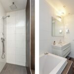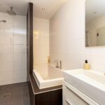De badkamer is eveneens modern uitgevoerd en voorzien van een regendouche, ligbad, wastafelmeubel, verlaagd plafond met inbouwspots en designradiator.