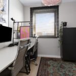 De hal/entree biedt toegang tot alle ruimtes in het appartement, namelijk een drietal slaapkamers van ca. 11,5 m2, 7 m2 en 6,5 m2, de moderne badkamer, de riante woonkamer met luxe open keuken en de inpandige berging met wasmachine-aansluiting. Één van de slaapkamers is momenteel in gebruik als werkkamer.