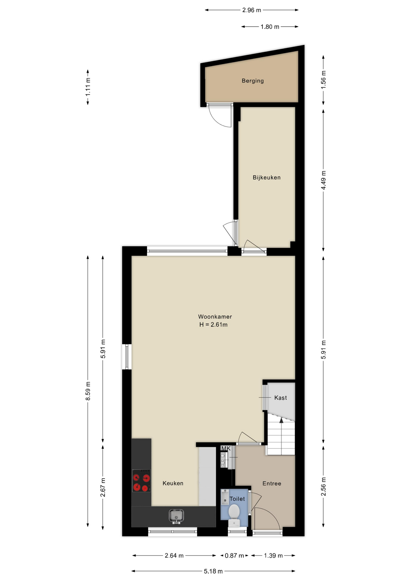 Je komt binnen in de hal met toegang tot het toilet, de trapopgang en de woonkamer. De woonkamer is heerlijk licht door de grote ramen en biedt genoeg ruimte voor een gezellige zithoek en een familietafel. De keuken bevindt zich aan de voorzijde en beschikt over diverse inbouwapparatuur. Vanuit de woonkamer loop je de bijkeuken in, die vervolgens weer toegang biedt tot de ruime tuin.
