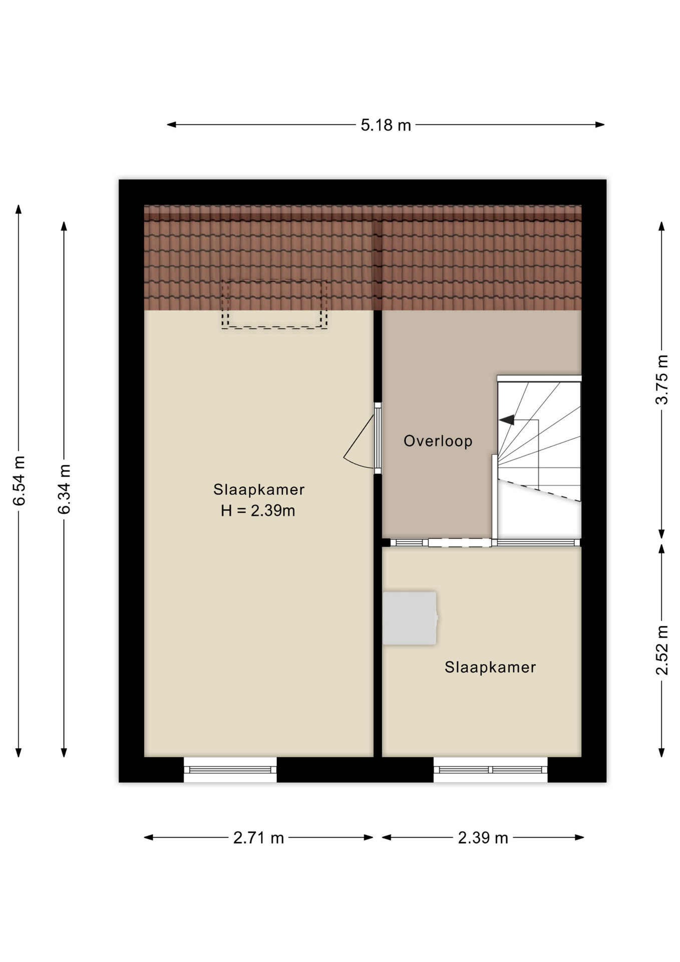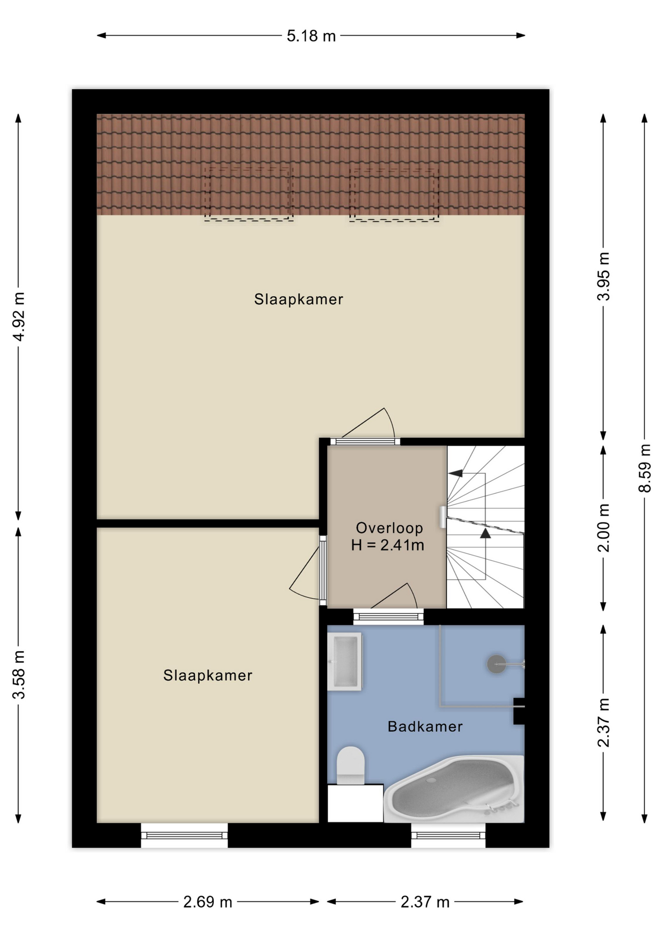 Hier zijn twee slaapkamers en de badkamer te vinden. De slaapkamers zijn ruim en praktisch in te delen met een tweepersoonsbed, kasten of een bureau voor de kinderen. Een derde slaapkamer is op eenvoudige wijze te realiseren. De badkamer is modern en heeft alles wat je nodig hebt, waaronder een douche, bad, wastafel en toilet.