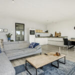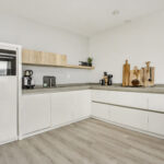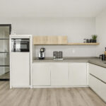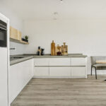 De luxe open keuken in L-opstelling sluit perfect aan op de moderne uitstraling van het appartement en is uitgerust met hoogwaardige Siemens-inbouwapparatuur, waaronder een inductiekookplaat, vaatwasser, koelkast, aparte vriezer en een combi-oven/magnetron. Het keramische werkblad en de rustige kleurstelling maken het geheel stijlvol en tijdloos. Aangrenzend aan de woonkamer bevindt zich een praktische interne berging.