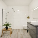 The sleekly finished bathroom features a walk-in shower, modern washbasin cabinet and contemporary tiling. In addition, there is a separate toilet with a small washbasin.