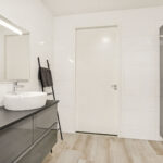 De strak afgewerkte badkamer is voorzien van een inloopdouche, modern wastafelmeubel en eigentijds tegelwerk. Daarnaast is er een separaat toilet met fonteintje.