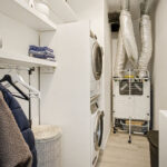 The luxurious open-plan kitchen in an L-shaped layout perfectly complements the modern character of the apartment and is fitted with high-quality Siemens built-in appliances, including an induction hob, dishwasher, refrigerator, separate freezer and a combination oven/microwave. The ceramic countertop and calm colour scheme give the kitchen a stylish and timeless appearance. Adjacent to the living room is a convenient internal storage room.