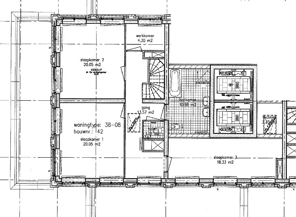 Overloop met toegang naar drie ruime slaapkamers. De vierde kamer is kleiner. Modern afgewerkte badkamer met inloopdouche, ligbad, wasmachineaansluiting en dubbele wastafel. Separaat bevindt zich het toilet. Vanuit de overloop is de vliering bereikbaar.