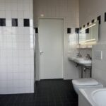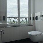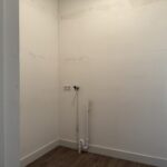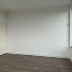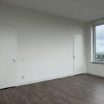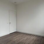 - Moderne afwerking met pvc-vloer, hoge witte plinten, strakke wanden en raambekleding.