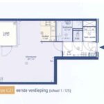 De indeling van het (op de 1e verdieping gelegen) studio-appartement is als volgt: