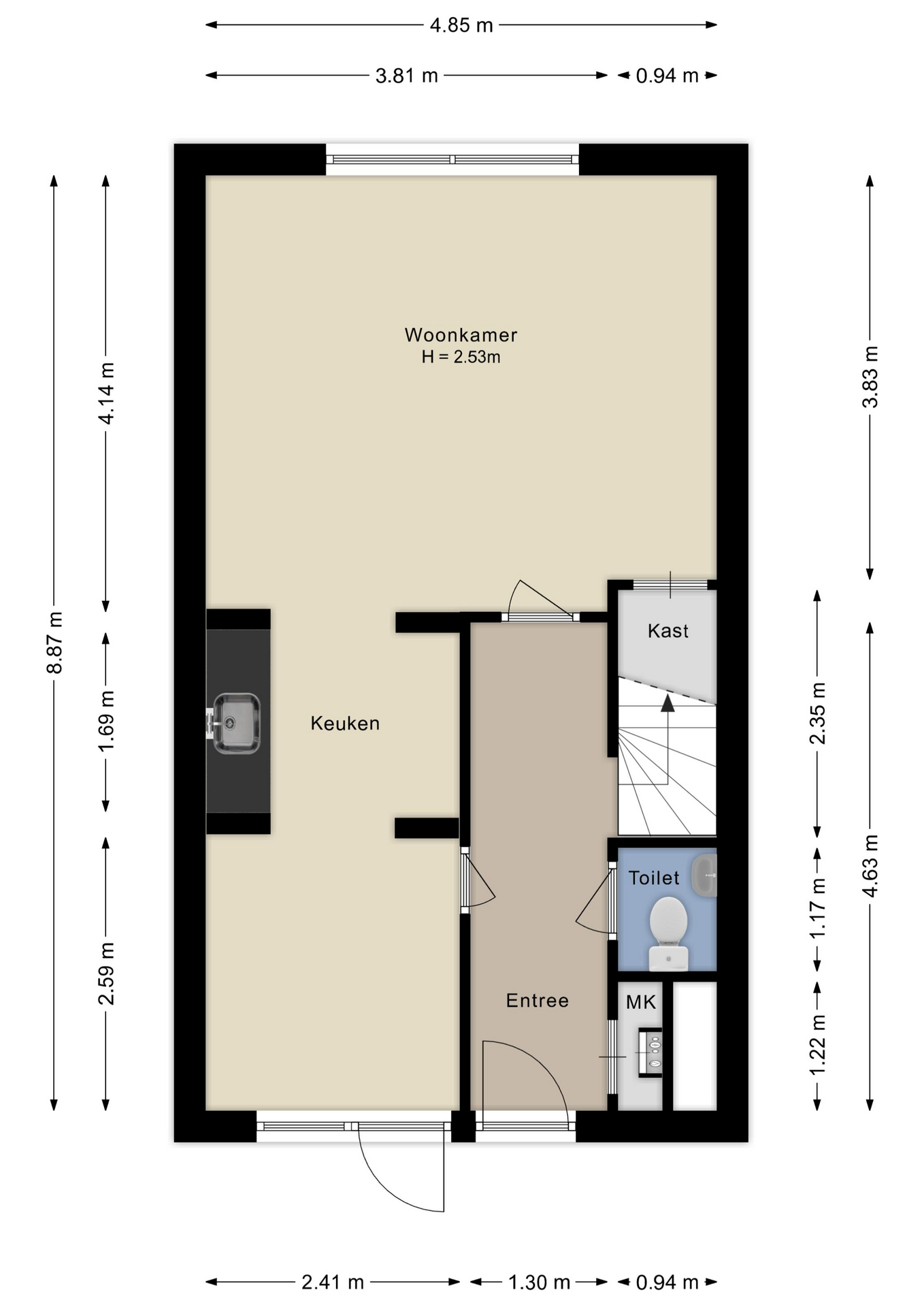 De entree komt uit in een hal die toegang biedt tot diverse ruimtes. Het separate toilet is voorzien van een fonteintje. Vanuit de woonkamer bereik je de trappenkast en de halfopen keuken. Deze eenvoudige keukenopstelling bestaat uit drie delen, met aan de overzijde ruimte voor apparatuur en een perilex-aansluiting. Vanuit de keuken en hal kom je in de kamer aan de voorzijde, ideaal als eetkamer en met toegang tot de galerij. In de hal vind je ook de meterkast en de trap naar de bovenverdieping.