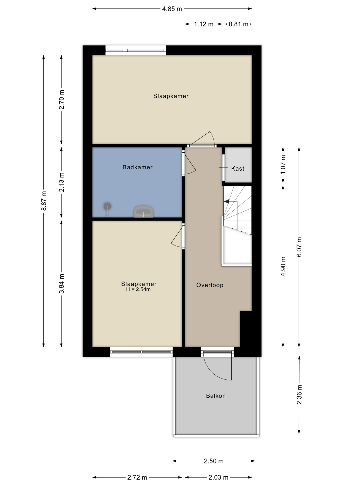 Hier vind je een royale overloop met vaste kast en toegang tot het zonnige balkon. Het appartement beschikt over twee ruime slaapkamers: één aan de voorzijde en één aan de achterzijde. De grotendeels betegelde badkamer is uitgerust met een douche, wastafel en aansluitingen voor wasapparatuur.