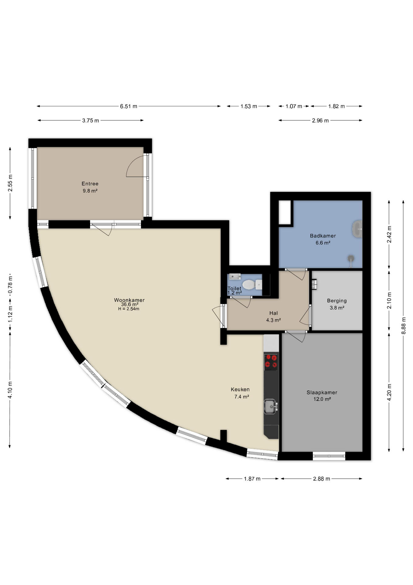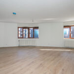 Via de entree kom je in de hal met toegang tot de multifunctionele ruimte en de woonkamer. De woonkamer is netjes gesausd en dankzij de vele ramen geniet je hier van een prettige lichtinval. De speelse ronde indeling geeft de ruimte een eigen karakter. Vanuit de woonkamer bereik je de tweede hal/gang, die toegang geeft tot de overige vertrekken.