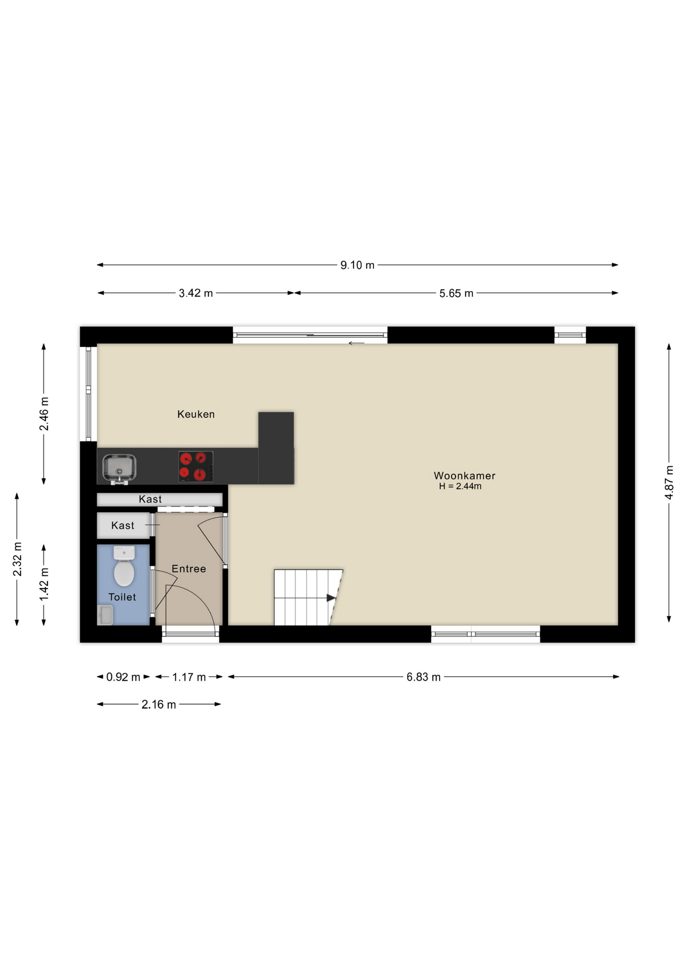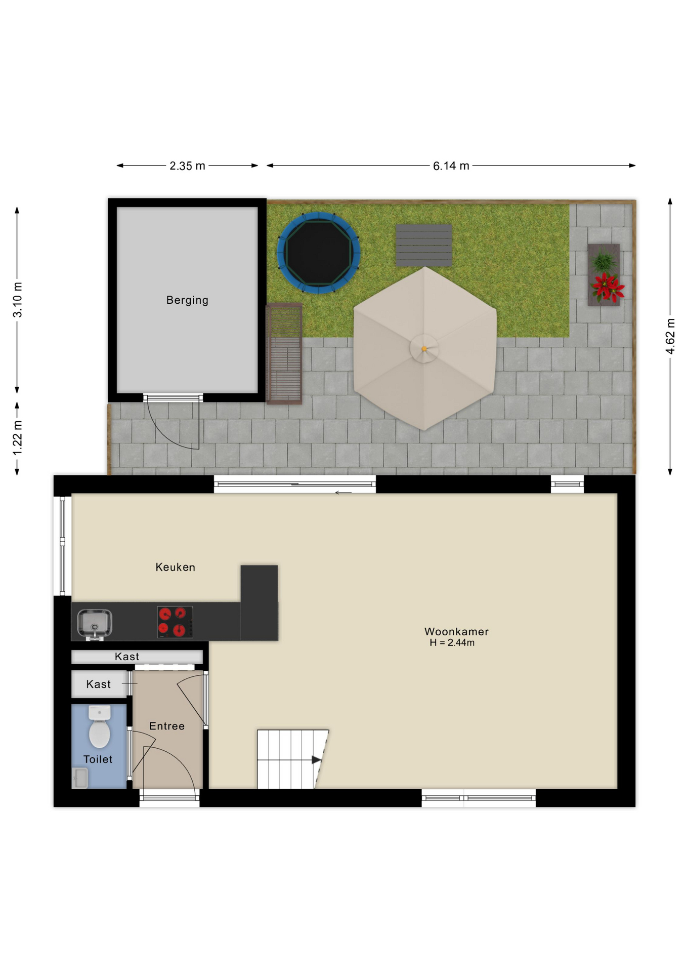 Via de entree betreedt u de woning, waar zich de meterkast en een toiletruimte met fonteintje bevinden. Vanuit de hal heeft u toegang tot de sfeervolle woonkamer met open keuken, die dankzij de schuifpui direct verbonden is met de achtertuin op het noordoosten. Deze tuin biedt veel privacy en beschikt over een vrijstaande stenen berging met elektra. De open keuken heeft in 2021 een moderne upgrade gekregen en is voorzien van een inductie kookplaat, oven, koel-vriescombinatie en een afzuigkap.