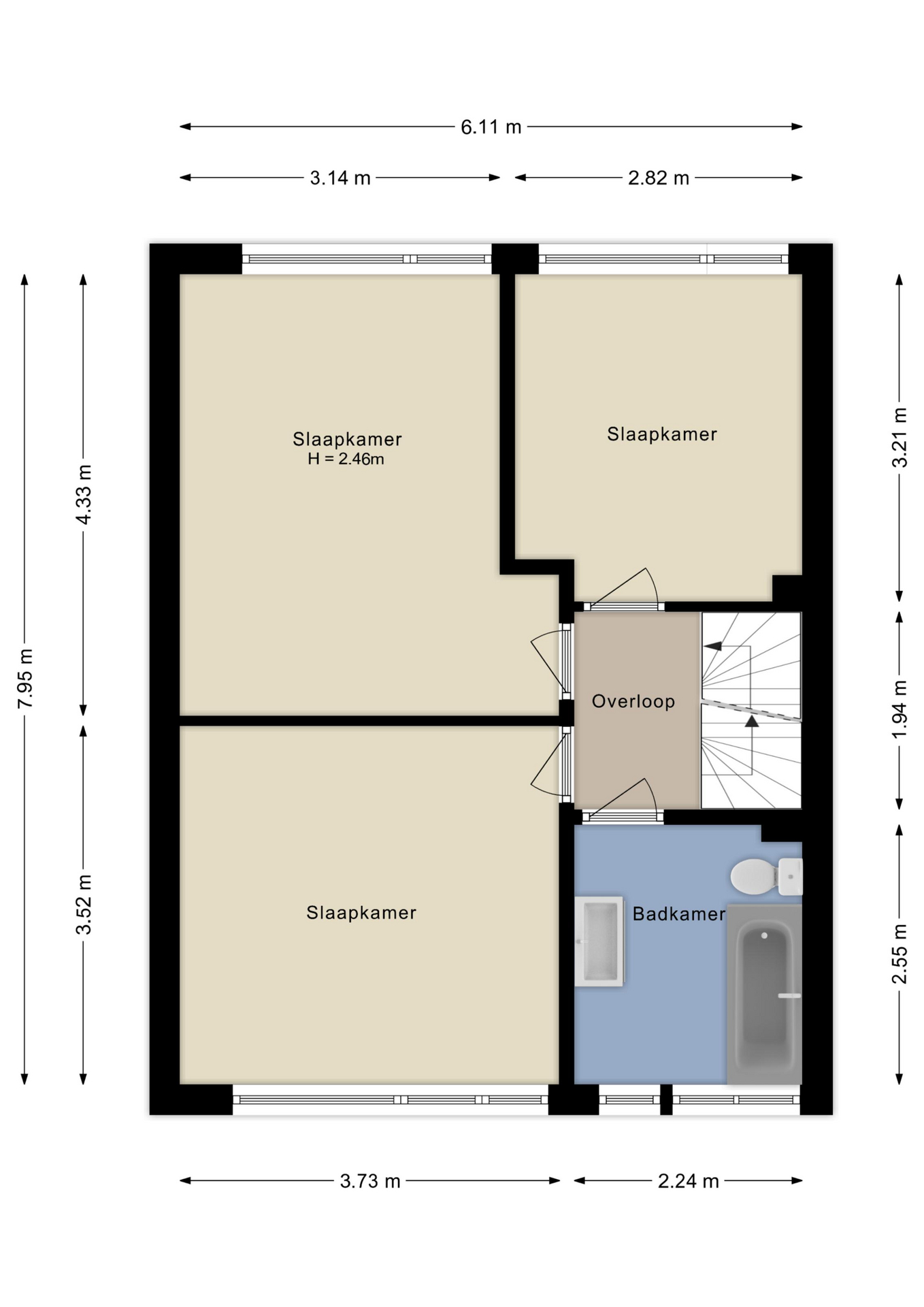 Op de eerste verdieping vind je drie slaapkamers, allen met genoeg ruimte voor bed en werkplek. De vierde slaapkamer op de zolderetage is de stille ster van dit huis – perfect voor een tiener, als logeerkamer of een rustige thuiswerkplek. De badkamer heeft een ligbad, tweede toilet en een wastafel met meubel.