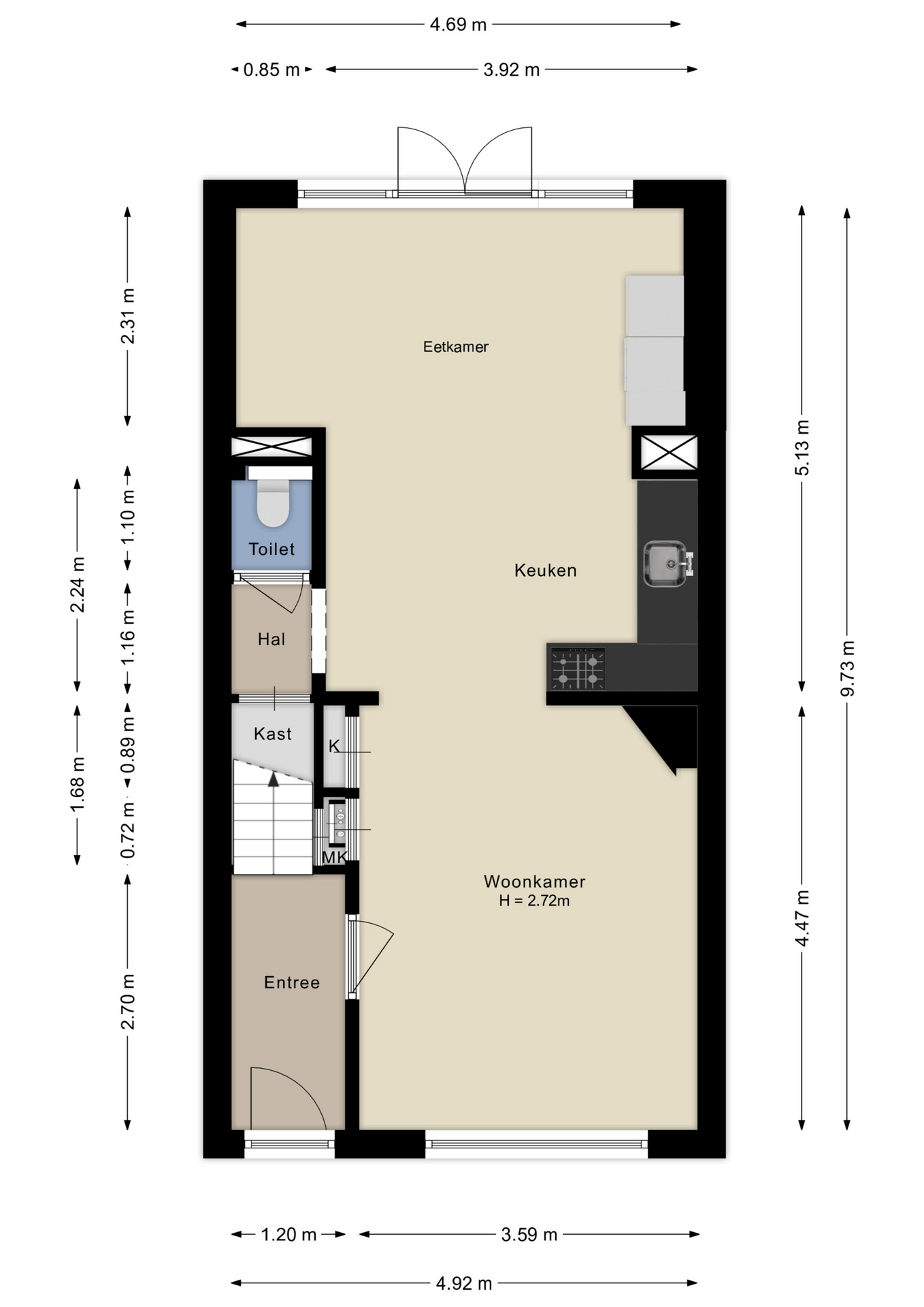 Entree/hal met trapopgang. Lichte woon-/eetkamer met een prettige woonkeuken aan de achterzijde. De moderne keuken is voorzien van 5-pits gaskookplaat, afzuigkap, koelkast, vaatwasser, oven, magnetron en quooker. Ook is er in de woonkeuken een prachtige op maat gemaakte vaste kastenwand gemaakt.