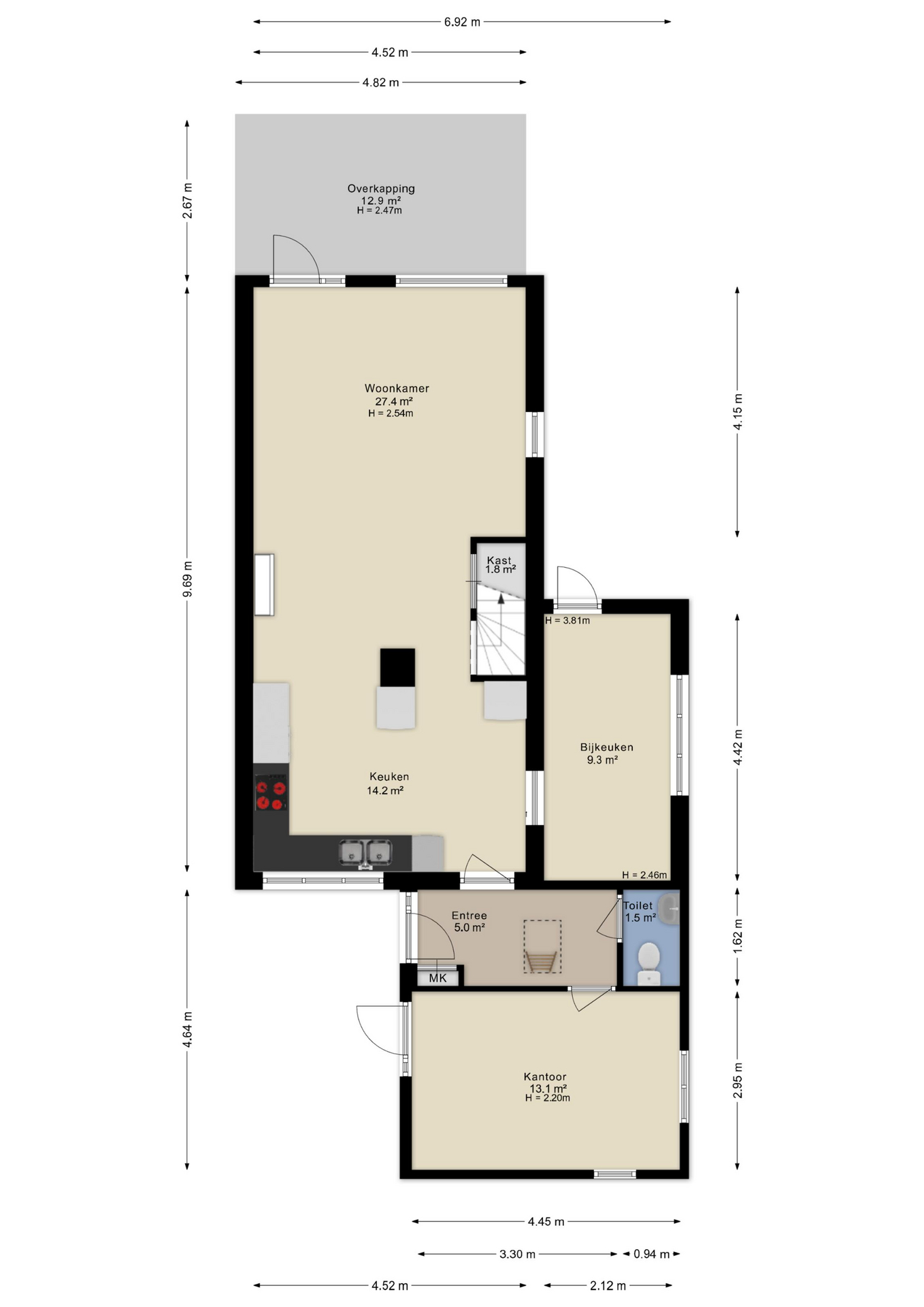 Zodra je de woonkamer betreedt, voel je de ruimte en het licht je tegemoet komen. De grote raampartijen zorgen voor een mooi uitzicht op je eigen tuin. De open keuken, met eigentijdse apparatuur, vormt het hart van het huis waar gegeten, gespeeld en gelachen wordt. Op de begane grond bevinden zich ook nog een ruime werkkamer en bijkamer, ideaal voor een werkplek aan huis, of speelkamer voor kinderen.