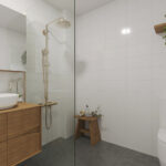 Op de eerste verdieping bevinden zich drie royale slaapkamers. Twee slaapkamers liggen aan de achterzijde van de woning, terwijl de derde slaapkamer zich aan de voorzijde bevindt en over de volledige breedte van de woning is gesitueerd. Deze indeling zorgt voor veel lichtinval in de kamers. In het midden van de verdieping ligt de badkamer, die grotendeels betegeld is. De badkamer is voorzien van een douche, wastafel en een wasmachineaansluiting. Er is tevens een aansluiting voor een toilet.