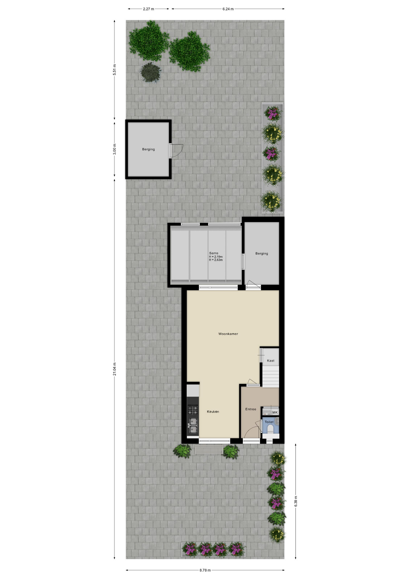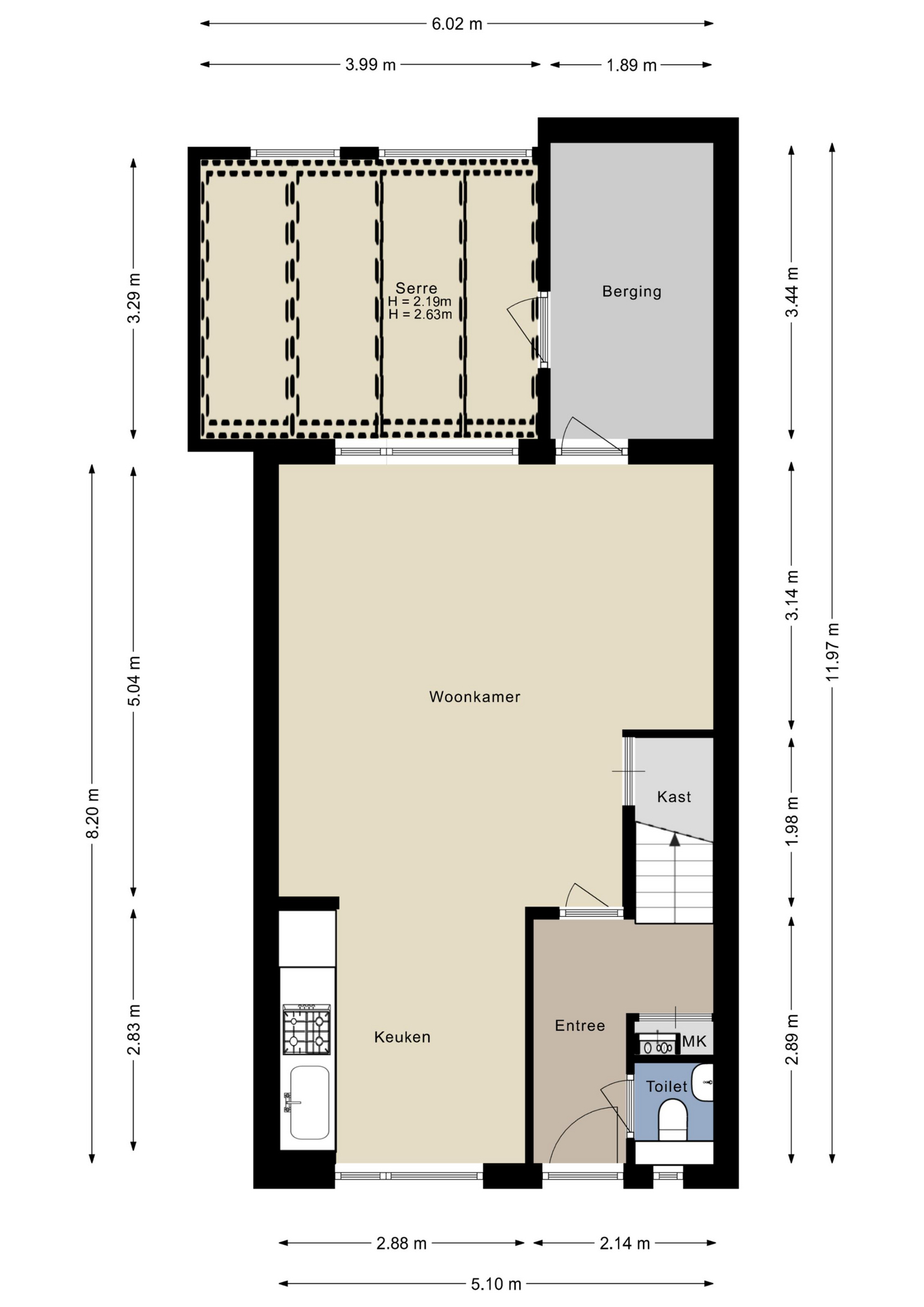 Bij binnenkomst kom je in de hal, die toegang biedt tot de ruime woonkamer. Deze woonkamer is licht en open van indeling. Vanuit de woonkamer kun je naar de keuken en de berging, vanwaar je door kunt lopen naar de serre en de achtertuin. Daarnaast is er in de woonkamer een trapkast voor extra opbergruimte. De open keuken is eenvoudig van afwerking en voorzien van een 4-pits gaskookplaat, een afzuigkap en een koelkast. De serre aan de achterzijde biedt extra ruimte en is een fijne toevoeging. In de hal vind je verder het volledig betegelde zwevende toilet met fontein en de meterkast.