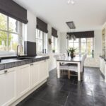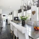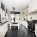 Je komt binnen via de hal met garderobe, nette toiletruimte, trapkast, trapopgang naar de eerste verdieping en inbouwkast v.v. witgoedaansluitingen. Vervolgens bereik je de luxe woonkeuken. Deze is gesitueerd aan de voorzijde en is heerlijk licht door grote raampartijen aan twee zijden. De keuken biedt meer dan voldoende ruimte voor een grote eettafel en is uitgerust met een fraaie inbouw-servieskast in authentiek landelijke stijl. Je vindt hier twee keukenmeubels in parallelle opstelling, voorzien van dikke stenen werkbladen. Apparatuur betreft een zespits gasfornuis met meervoudige oven, Quooker, 7 L boiler, afzuigkap, vaatwasser en Amerikaanse koel-/vriescombinatie. De living is gesitueerd aan de achterzijde, en biedt zodoende veel privacy. Net als de keuken is dit vertrek afgewerkt met een hardstenen vloer v.v. vloerverwarming en grote raampartijen aan twee zijden. In de uitbouw is een lichtstraat van 1x3 meter geplaatst, die is voorzien van screens. Ook vind je hier een moderne schouw met gashaard en tv-meubel. Dubbele openslaande deuren geven toegang tot de tuin en spotverlichting zorgt voor veel sfeer.