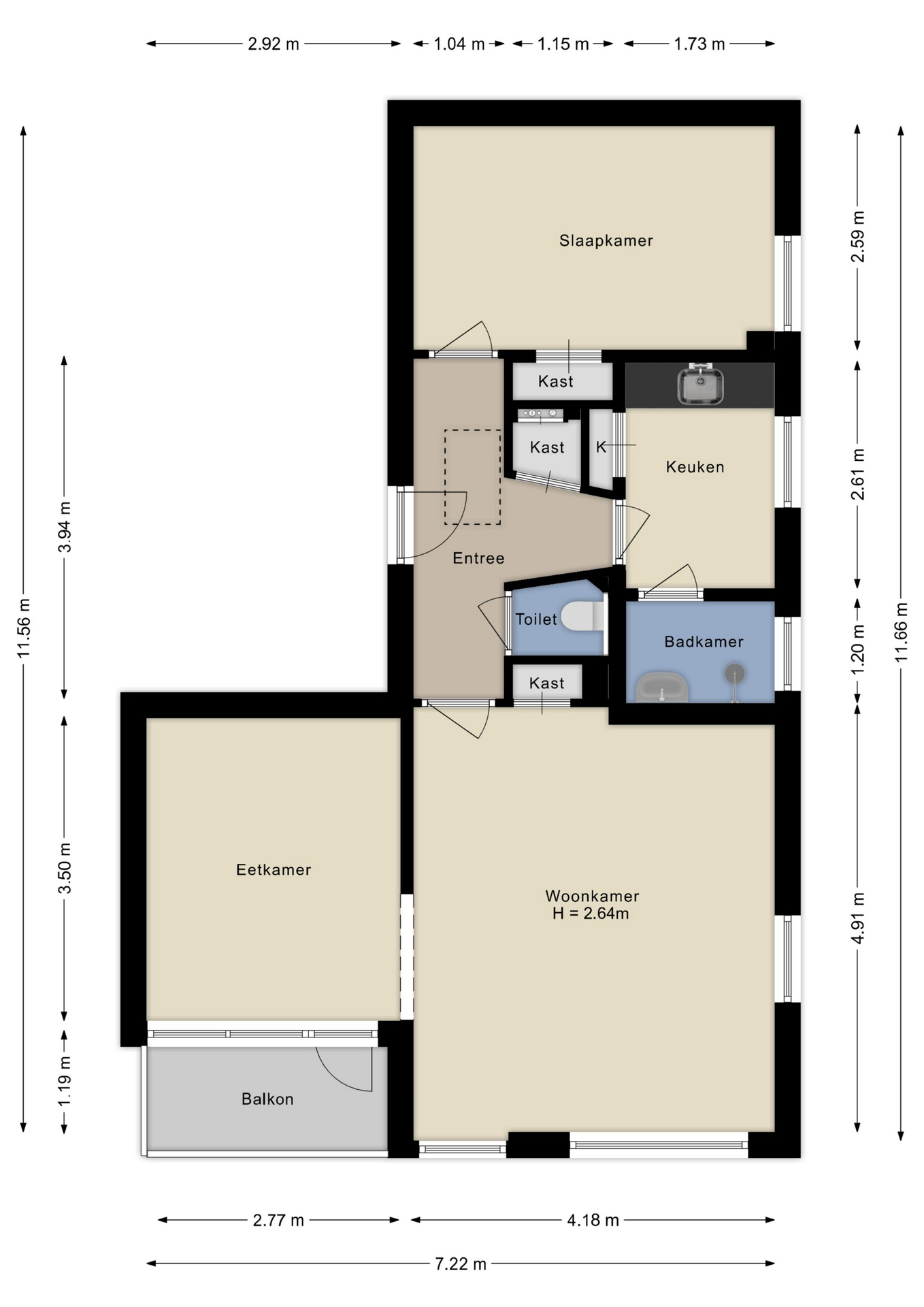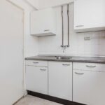 Ruime hal met meterkast en extra bergruimte. Aan de rechterzijde bevindt zich de lichte en ruime woonkamer met een vaste kast. Vanuit hier heb je toegang tot de zijkamer, die uitstekend dienst kan doen als werk- of slaapkamer en toegang biedt tot het zonnige balkon op het zuiden. De gesloten keuken is voorzien van een eenvoudig keukenblok, vaste kast en aansluiting voor de wasmachine. Aangrenzend tref je de grotendeels betegelde badkamer met douche en wastafel. Via de hal is tevens het separate toilet bereikbaar. Aan de zijkant bevindt zich de royale hoofdslaapkamer, die zich uitstrekt over de volledige breedte van de woning en beschikt over een vaste kast.