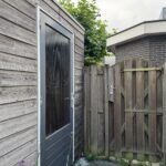 • Vrijstaande houten berging in de achtertuin, voorzien van elektra.