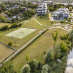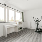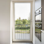 Here you’ll discover the open-plan kitchen, dining, and living area, along with a sunny south-facing balcony equipped with fixed sun protection. The balcony is the perfect spot to unwind while enjoying park views, and the living room shines with natural light from large windows. The open kitchen with an island comes fully fitted with appliances – including combi ovens, an induction cooktop, an extractor hood, dishwasher, refrigerator, and freezer – ideal for interactive cooking and entertaining while taking in the view.