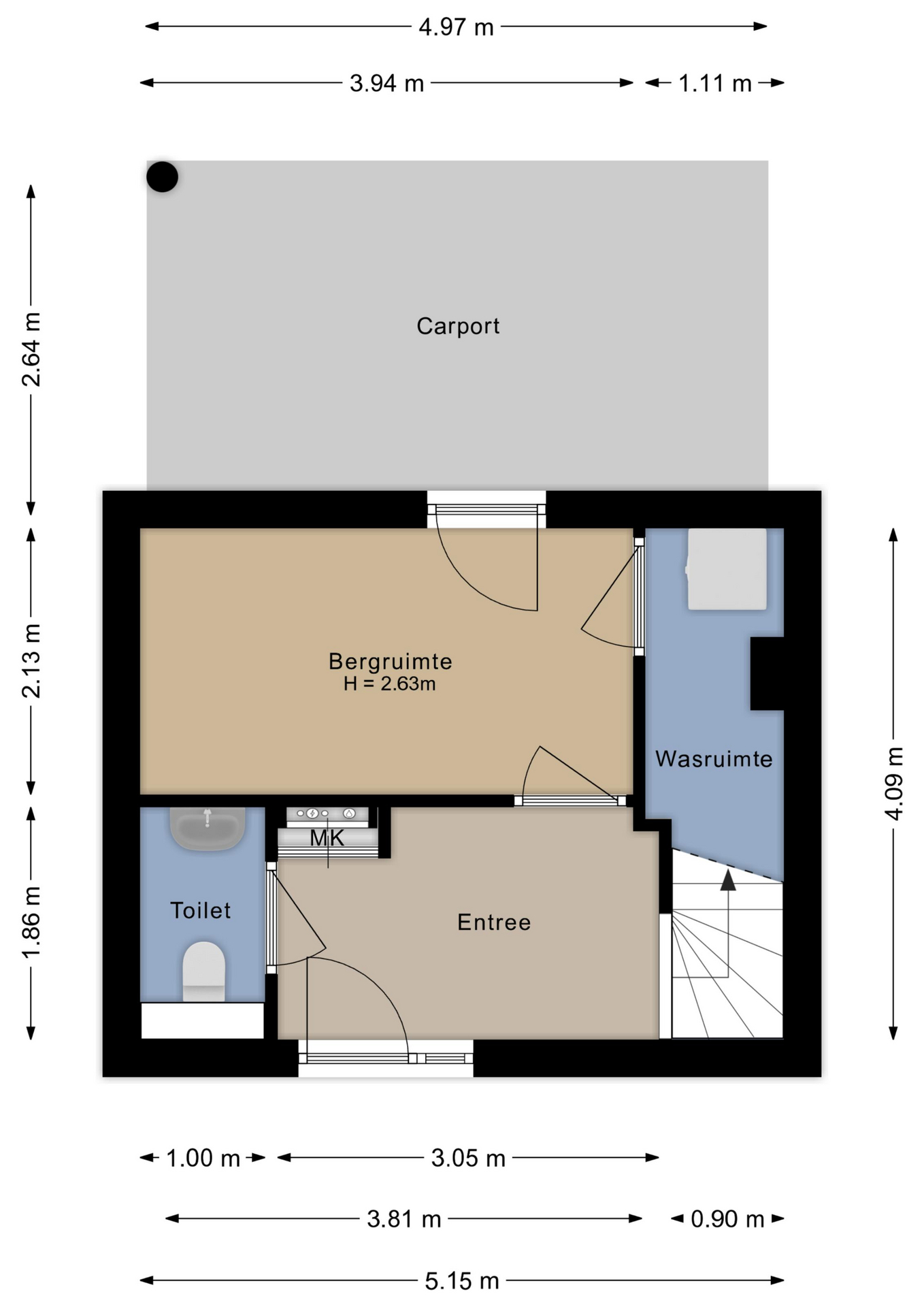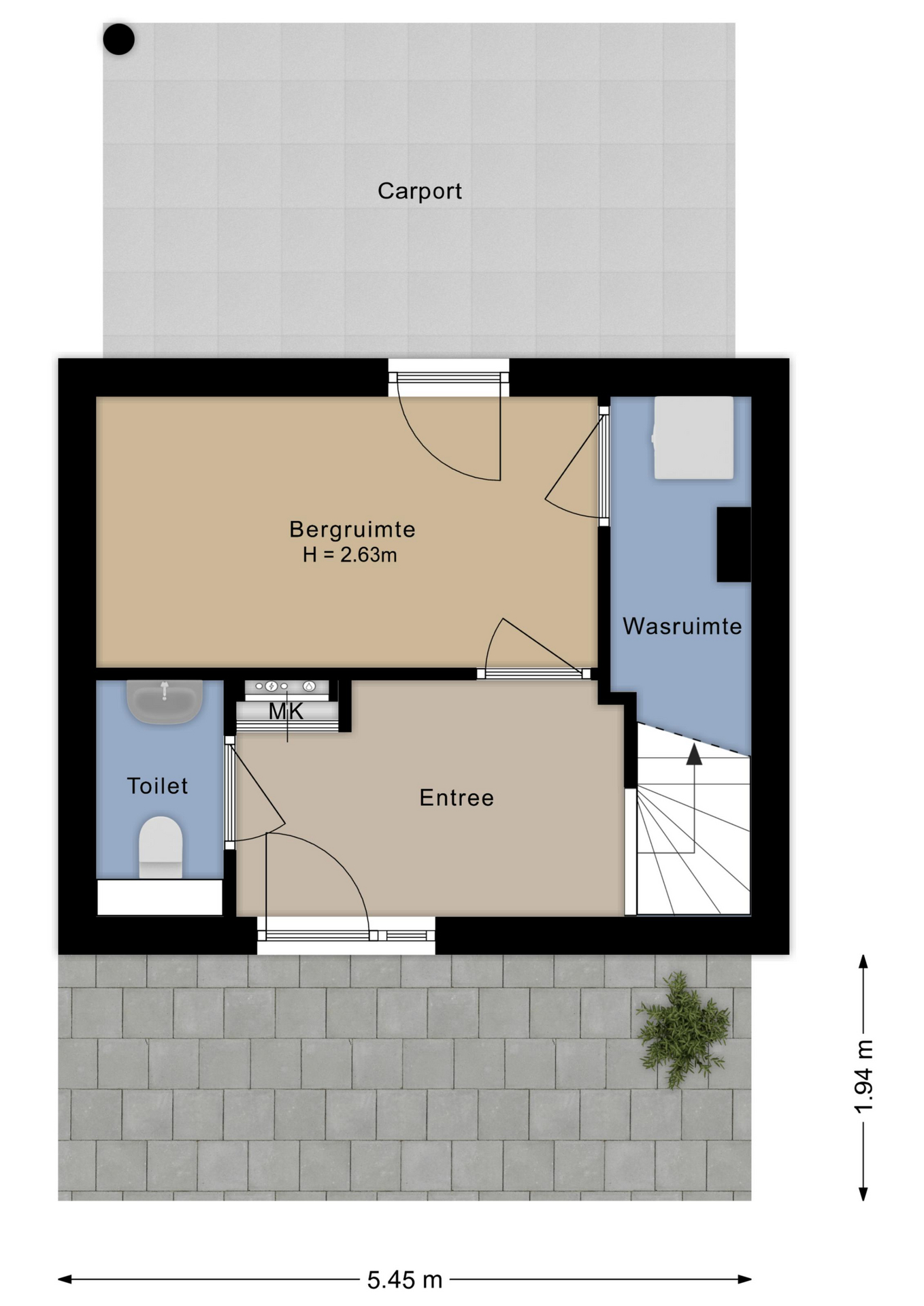 Via de voordeur kom je binnen in de hal, waar je een toilet, trapopgang, meterkast en inpandige berging vindt. De berging, die ook bereikbaar is via de achterzijde (direct naast de eigen overdekte parkeerplaats), leidt naar de wasruimte met alle aansluitingen voor je witgoed en extra opbergruimte.