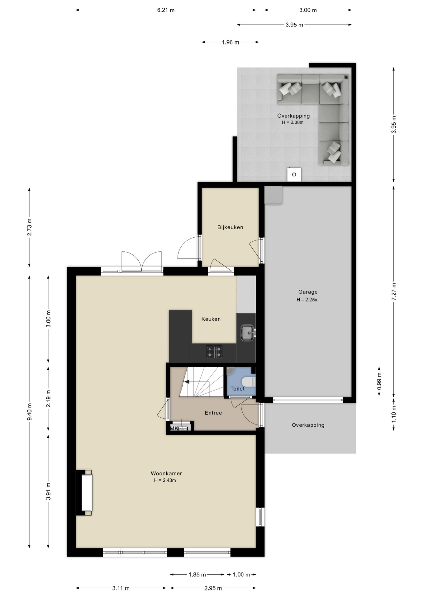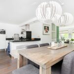 Via de entree met hal, modern toilet en meterkast stap je de brede, lichte woonkamer binnen. Deze is voorzien van een houten vloer, strak afgewerkte wanden, openslaande deuren naar de tuin en een sfeervolle gashaard voor de koude winteravonden. Aan de achterzijde bevindt zich de royale open keuken, compleet uitgerust met diverse inbouwapparatuur zoals een 4-pits gasstel, afzuigkap, stoomoven, combi-oven, koelkast, vaatwasser en een aparte boiler. Aansluitend ligt de praktische bijkeuken met toegang tot zowel de tuin als de garage.